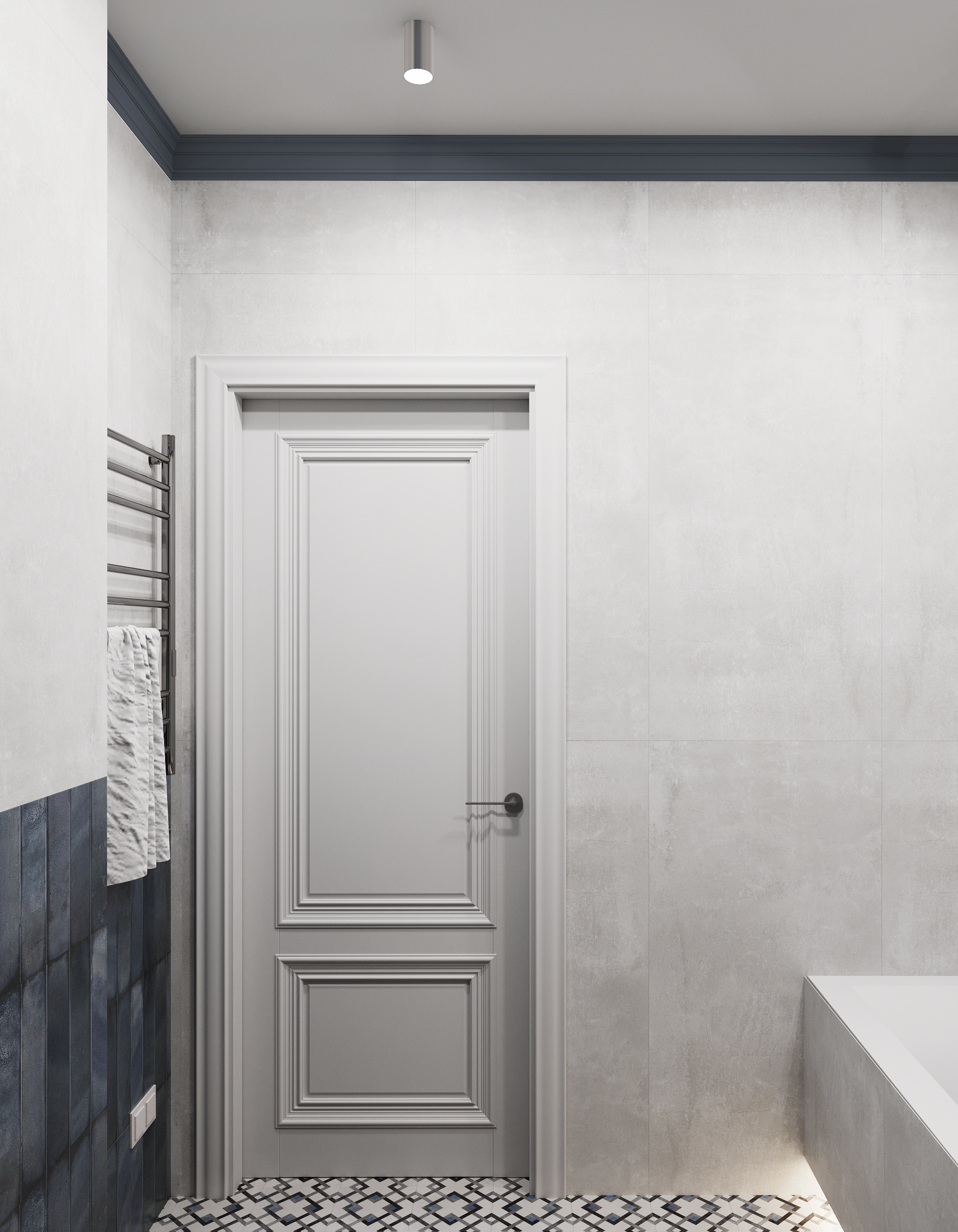 Проект ванной комнаты представляет собой гармоничное сочетание синих и серых оттенков, создающих атмосферу спокойствия и умиротворения. Для акцента на стенах использован керамогранит синего цвета, что добавляет глубину и визуальный интерес. Основной цвет керамогранита использован в светло сером цвете с матовой фактурой, что придаёт помещению современный и элегантный вид.